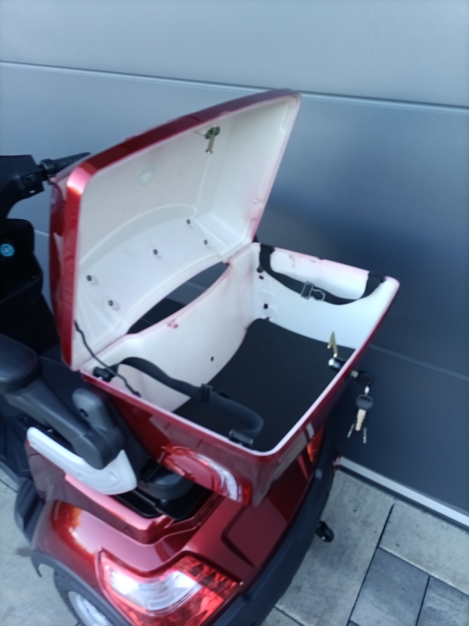 Pohodlí na prvním místě - sedačka je navržena pro maximální komfort a díky sklopným opěrkám si snadno najdete ideální polohu. Zadní část tříkolky nabízí dva uzamykatelné úložné prostory, kam bezpečně uložíte nákup či osobní věci.