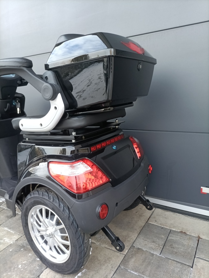 Bezpečnost a praktičnost v jednom - tříkolka stojí na stabilních 10" kolech a spolehlivé bubnové brzdy zajistí bezpečné zastavení. Zadní brzda je vybavena aretací pro bezpečné nastupování a vystupování z elektrické tříkolky. Kompletní sada osvětlení včetně blinkrů, obrysových i dálkových světel a zpětných zrcátek zajišťuje bezpečnou jízdu i v hustším provozu. Řídítka je možné uzamknout pro zabezpečení proti odcizení.