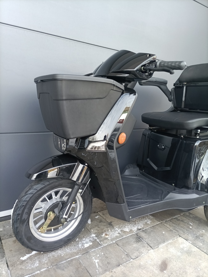 Elektrická tříkolka CY11 s designovým černým kapotováním, pohodlným sedlem s opěrkami, silným zpřevodovaným bezkartáčovým motorem a moderní lithiovou 60 V 20 Ah baterií